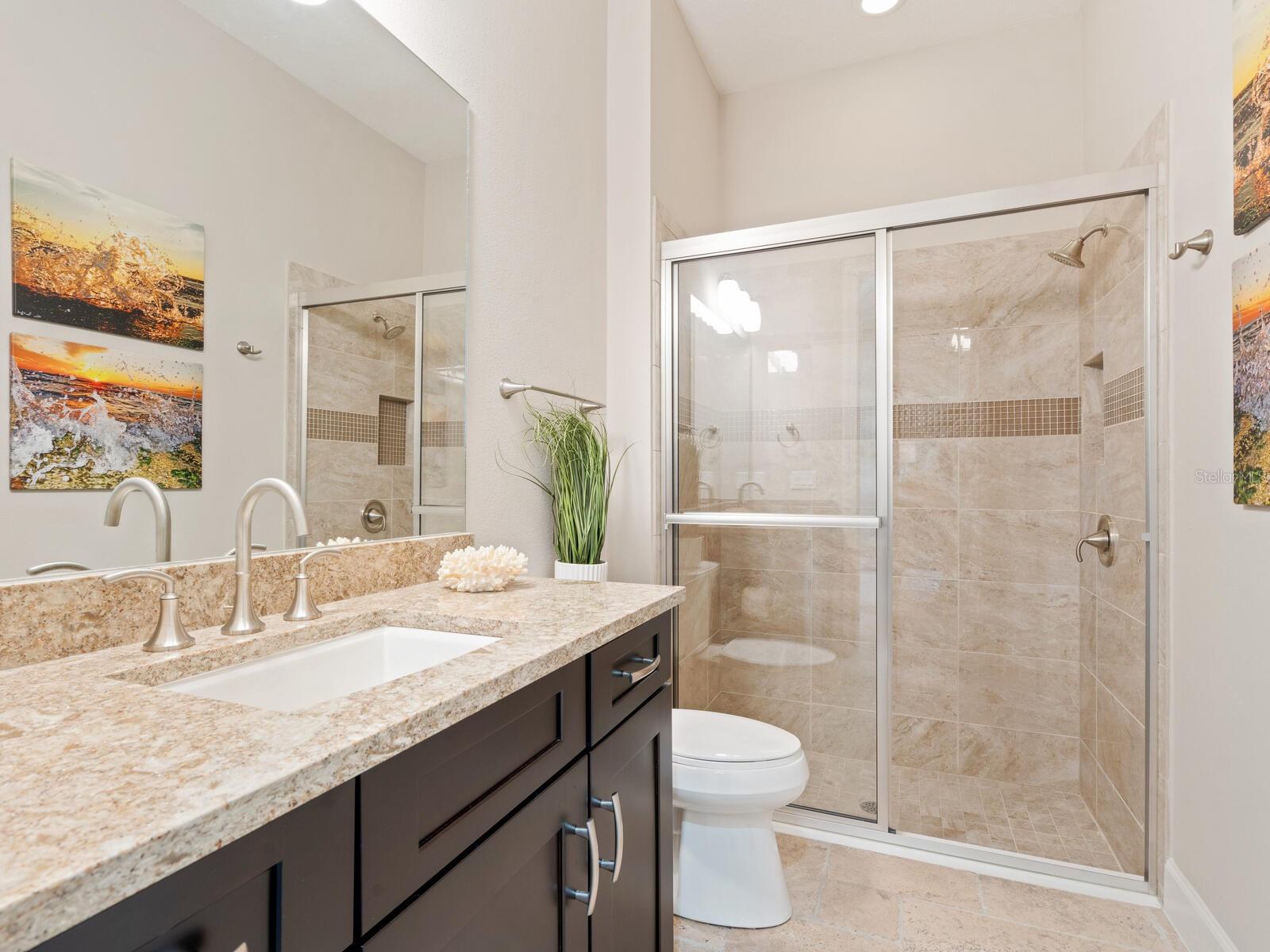 Discover unparalleled executive living in this Pallazio floor plan home, where architectural elegance meets convenience in the esteemed gated community of Cobblestone on Palmer Ranch. This one-owner, meticulously maintained residence exudes model-perfect allure and is move-in ready. Located on a premium corner lot, this spectacular home features three bedrooms, a den and three baths in an open-concept floor plan. Enter through leaded-glass doors to the foyer, showcasing a double tray ceiling to the spacious great room, kitchen and dining area. The expansive kitchen, which boasts an oversized island with a seating area, is a wonderful gathering area when entertaining. This well-planned kitchen features quartz countertops, stacked-glass tile backsplash, 42-inch cabinets with crown molding and soft-close drawers, dual sinks and high-end appliances, including a Sub-Zero refrigerator, gas cooktop, wine refrigerator, abundant storage and walk-in pantry. The great room and kitchen flow seamlessly, overlooking the fabulous outdoor living area through fully pocketing glass sliding doors. The spacious primary suite is your private retreat, featuring a tray ceiling and bay window overlooking the pool and water and an oversized, fully customized walk-in closet. Pamper yourself in the luxurious, spacious bath with double sinks and a glass-walled walk-in shower. The split bedroom plan offers privacy for guests, with two large guest bedrooms and one en suite. The laundry room offers high-efficiency appliances, storage and a utility sink. Additional features: 10-foot ceilings, 8-foot doors, elegant crown molding, travertine floors and hurricane-impact windows and doors. The expansive, covered, screened outdoor living space is like living in your own resort, featuring a sparkling pool, a waterfall and plenty of space to enjoy the sun and shade. You'll enjoy the outdoor living room and gas fireplace as an extension of the home. Prepare meals in the summer kitchen, including a natural gas grill, refrigerator and sink, and dine alfresco on your beautiful lanai. Panoramic screens add to the enjoyment of the serene water view. The home's elevation does not require flood insurance; all windows, doors, and garage doors are impact-rated to current hurricane codes. Professionally landscaped, paver driveway and walkway; irrigation is provided through the HOA. Cobblestone is a gated maintenance-free community offering resort-style amenities: an impressive clubhouse, fitness/workout gym with state-of-the-art equipment, yoga, aerobics, pickleball, bocce ball, community heated swimming pool and spa, dog park, and weekly activities with a full-time, on-site manager/activities director. Centrally located and convenient to everything: multiple golf courses, tennis, the Legacy Trail, where you can enjoy miles of walking and biking, and 15 minutes to the world-famous white sand beaches of Siesta Key, downtown Sarasota, and Venice. Minutes to shopping, hospitals, restaurants, and Interstate 75 north to Tampa and south to Naples.